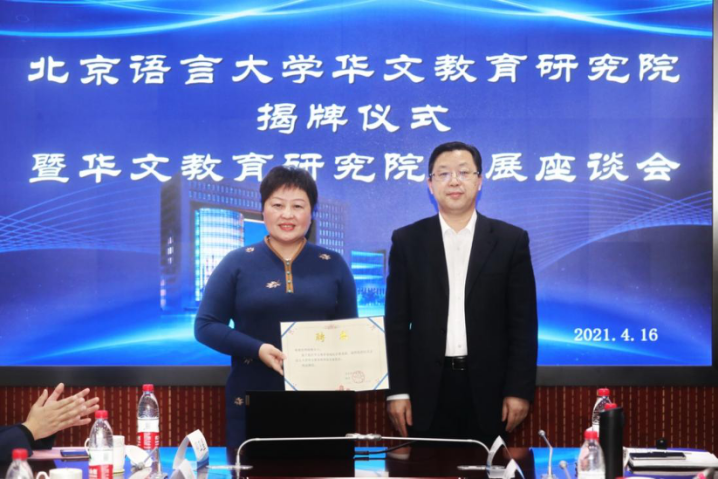 2021年4月16日,北京语言大学华文教育研究院揭牌仪式暨华文教育研究院发展座谈会在北京语言大学综合楼909会议室隆重举行。北京语言大学校长刘利,文化中国基金主席、梅蘭书院校董会主席李晓梅,北京大学教授陆俭明,北京语言大学教授李宇明,汉考国际总经理李佩泽以及北京语言大学相关职能部门负责人出席了揭牌仪式。参加揭牌仪式的还有汉语国际教育研究院的教职工和学生代表,揭牌仪式由汉语国际教育研究院院长吴应辉教授主持。