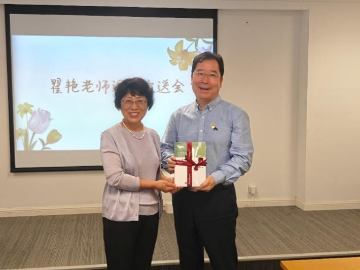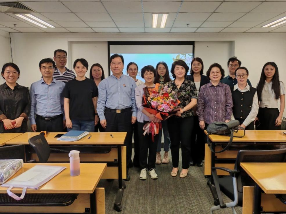 随后,研究院举行了翟艳教授荣退欢送会。吴老师首先介绍了翟艳教授调入研究院以来所做的贡献,对翟老师在科研、教学和人才培养上做出的成绩表示了充分的肯定,对翟老师表达了崇高的敬意和真诚的祝福,并代表研究院向翟老师送上鲜花和纪念品。翟艳老师分享了自己在北京语言大学37年的工作经历与感悟,对自己教学、管理及科研方面进行了总结,并对研究院的领导和同事们表达了感谢,为研究院赠送了自己的专著。最后,在场老师们为翟老师送上祝福并合影留念。
