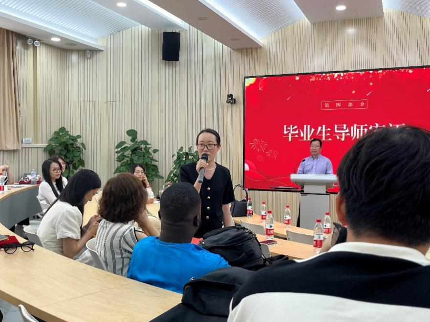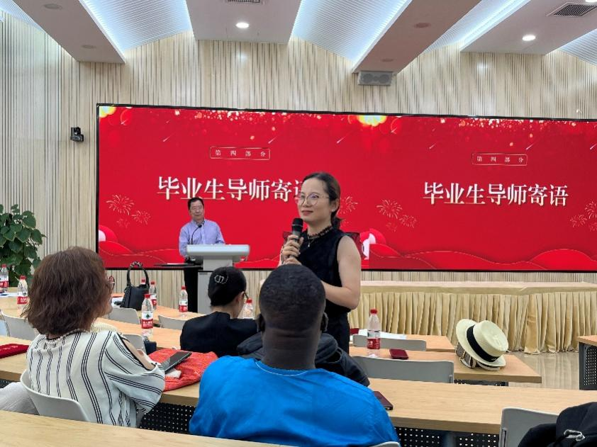 张博教授作为导师代表发言,她首先对全体毕业生和导师表示祝贺,并语重心长地提出,作为社会的精英人才,同学们一定要目光长远,多为社会做贡献,要把关注的重点放在自己的使命和责任上,为推动世界发展贡献自己的力量。