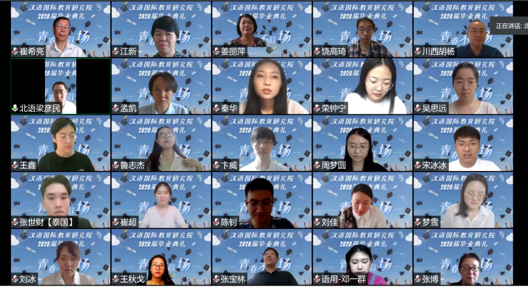 6月22日上午9时,北京语言大学汉语国际教育研究院2020届线上毕业典礼正式举行。在汉语国际教育研究院挂牌成立一周年之际,大家齐聚一堂,庆祝9位博士生、36位硕士生顺利毕业。毕业典礼由研究院党总支书记梁彦民主持,崔希亮院长、吴应辉常务副院长、姜丽萍副院长、研究院全体教师及毕业生一起参加了典礼。